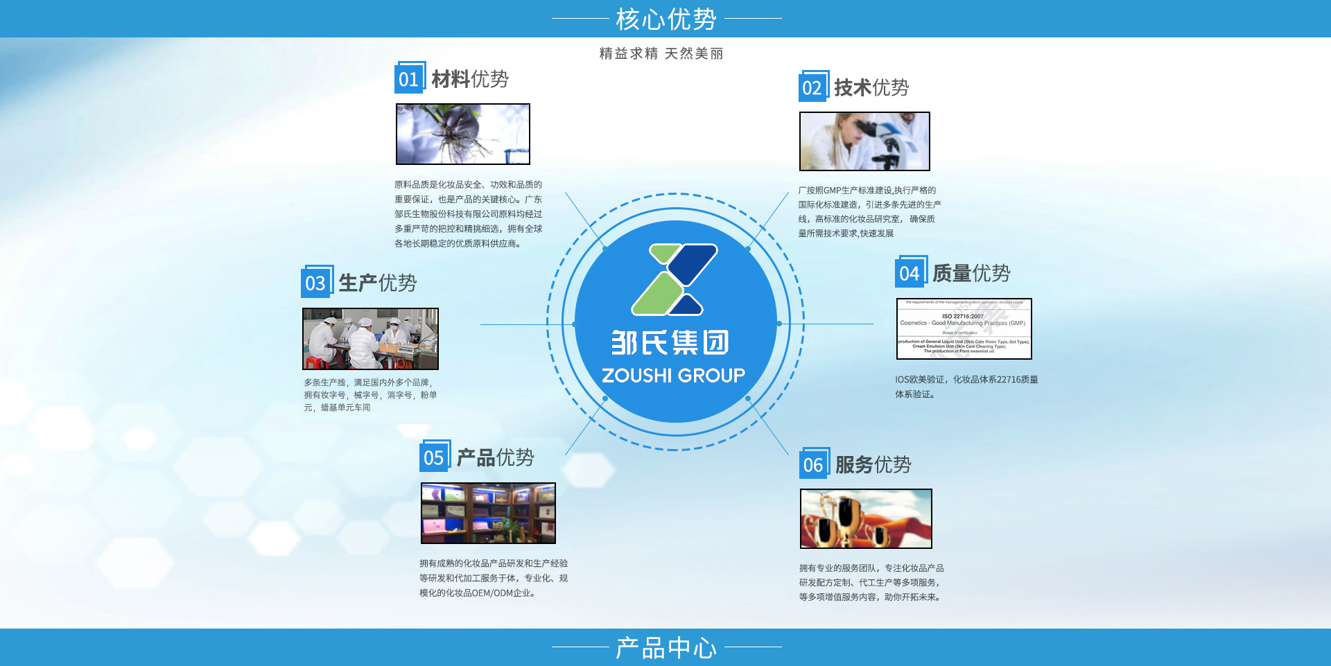 廣東鄒氏生物科技股份有限公司是一家集原料研制、配方開發(fā)、加工生產(chǎn)及配套性服務(wù)為一體的全球化化妝品OEM/ODM服務(wù)企業(yè)。鄒氏生物秉承“精益求精,天然美麗”的經(jīng)營理念,始終孜孜不倦的在美業(yè)領(lǐng)域深耕,經(jīng)過不斷發(fā)展完善與技術(shù)提升,在行業(yè)內(nèi)頗具口碑和影響力。公司擁有雄厚的資金實力、先進(jìn)的生產(chǎn)設(shè)備以及大批高精專的人才儲備,旨在打造一個純自主研發(fā),純自主生產(chǎn)以及管理的高科技日用美妝OEM/ODM品牌。 在延續(xù)高質(zhì)量產(chǎn)品和服務(wù)的同時,鄒氏生物始終秉承著純粹的生產(chǎn)理念,在研發(fā)、生產(chǎn)、品控、營銷等多方面升級,配備雄厚的科研力量,引進(jìn)先進(jìn)生產(chǎn)設(shè)備,遵循嚴(yán)苛的品質(zhì)管理標(biāo)準(zhǔn),提供專業(yè)的全方位營銷服務(wù),最大程度地實現(xiàn)資源整合,致力于成為世界優(yōu)秀化妝品工廠。為廣大品牌商以及消費市場輸送品質(zhì)優(yōu)越、高效安全的日用化工、美容美妝、肌膚護(hù)理產(chǎn)品。